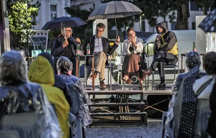 Die schnell mit Regenschutz versorgte und halbwegs bequem sitzende Masse der Besucher harrte jedenfalls bis zum Ende um 22 Uhr aus. Auch Fragen wurden natürlich von beiden Experten rasch beantwortet – und die den Badener Josefsplatz umrandenden 20 Lichtstelen mit 40 Bildern ergänzen alle Erläuterungen vorbildlich.