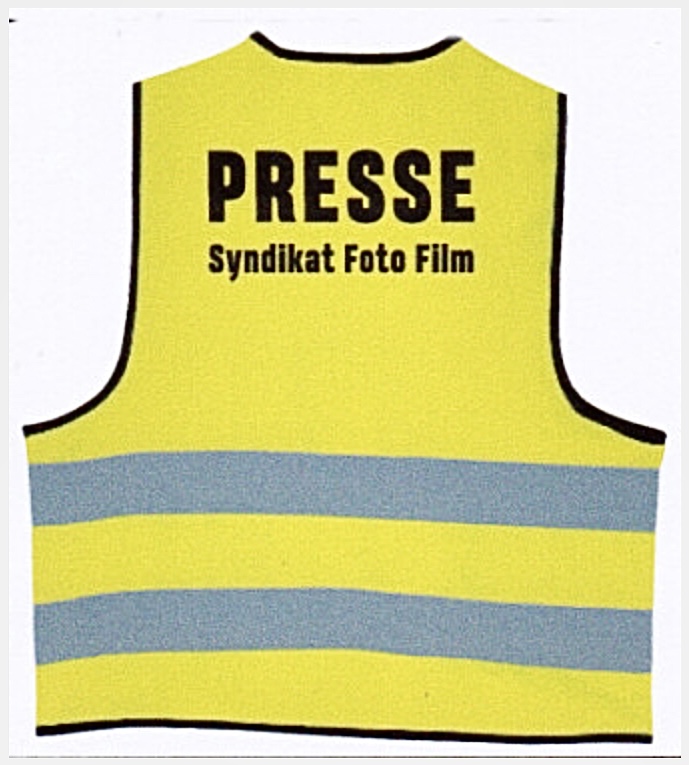 Bei Außeneinsätzen bewährt sich in vielen Situationen eine reflektierende Warnweste mit PRESSE-Aufdruck.